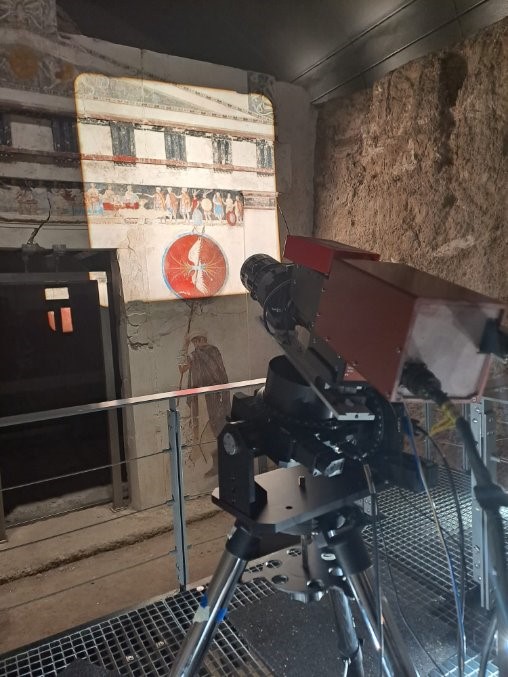 The Short-wave Infrared (SWIR, i.e. ~1000-2500nm) reflectance hyperspectral imaging can operate at both close- and mid-range as well as remote distances (up to tens of metres) at sub-mm spatial resolution and high spectral resolution. In its remote configuration, data collection is feasible from one fixed position on the ground regardless of the height of the monument/object. SWIR spectral imaging can identify or distinguish different organic and synthetic materials (such as binders or adhesive) as well as providing more definitive identification for some inorganic materials (e.g. salts and some specific pigments such as azurite). The longer wavelength of the SWIR range can reduce scattering and thus penetrate more easily through materials that may be opaque under VIS/NIR illumination. Images can be obtained through any of the spectral channels and can reveal features such as faded drawings, writings and preparatory sketches, as well as areas of degradation and past intervention.