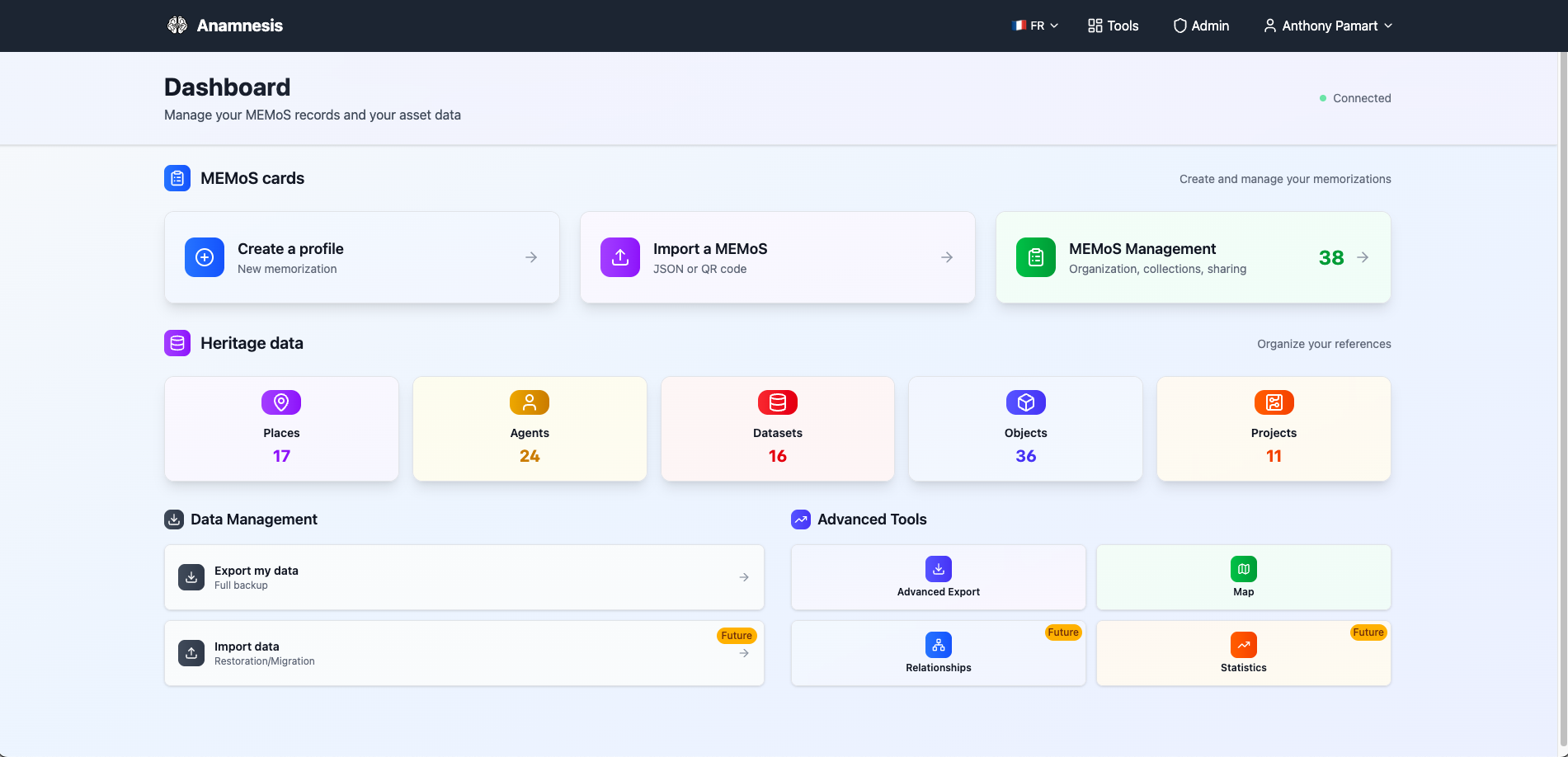 ANAMNESIS is an open-source web platform designed to document, structure, and preserve digitization workflows in Cultural Heritage (CH) and Heritage Science (HS). Built on the W7 semantic framework (What, Why, Who, Where, When, How, Which), it enables fine-grained metadata and paradata documentation for HS imaging and measurments activities—from data acquisition to processing and analysis—while ensuring traceability, reproducibility, and FAIR compliance.